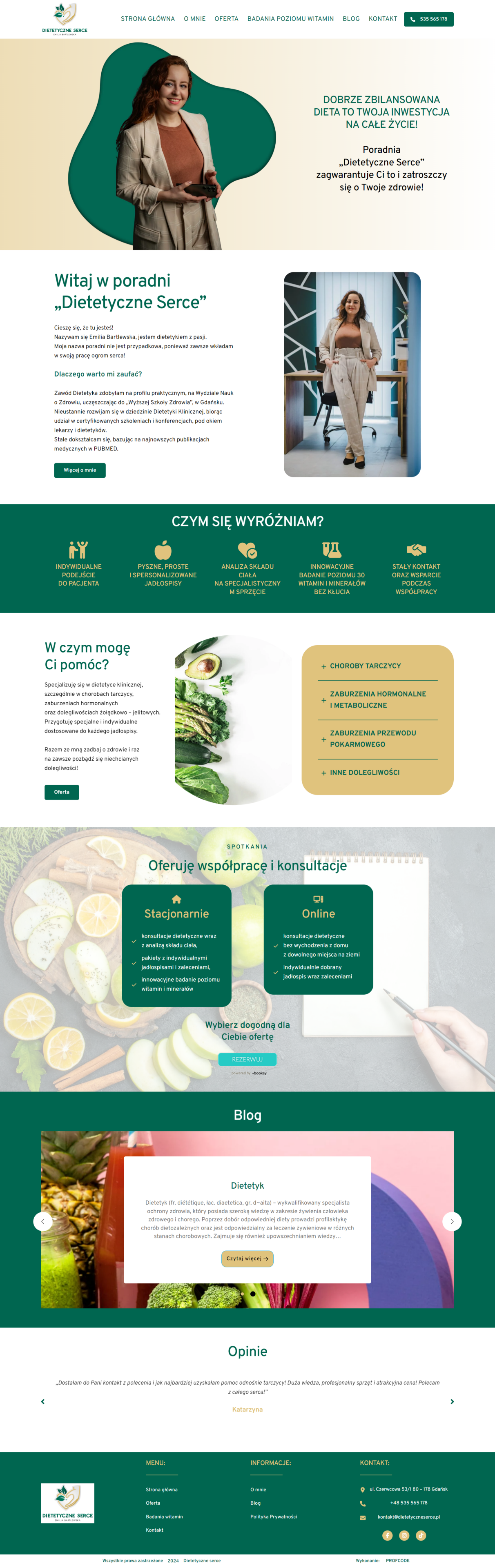 Strona internetowa oparta o system zarządzania treścią CMS WordPress, Pełna responsywność, Blog, Cennik usług, Formularz kontaktowy z zabezpieczeniem antyspamowym, Mapa Google z siedzibą